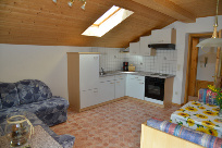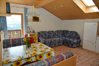 Diese Wohnung hat ca. 40 m2 und ist für zwei bis vier Personen gerechnet. Dieses Bild wurde von der Balkontüre aus aufgenommen. Es zeigt die Küchenzeile sowie einen kleinen Ausschnitt der Sitzgruppe. Auf den Balkon kommen Sie entweder vom Wohnzimmer oder vom Shlafzimmer aus. Dort befinden sich auch Stühle und ein Tisch.